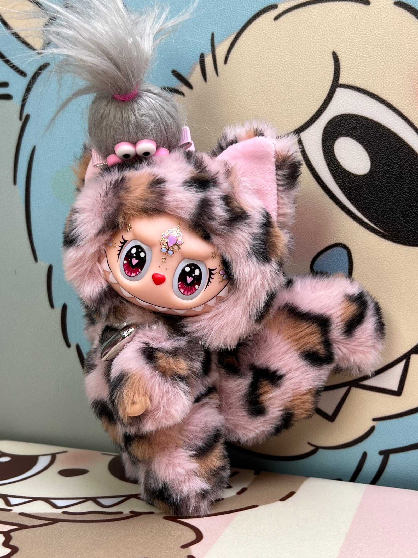 18cm Custom Pink Leopard Cat Labubu vinyl plush pendant18cm Custom Pink Leopard Cat Labubu vinyl plush pendant